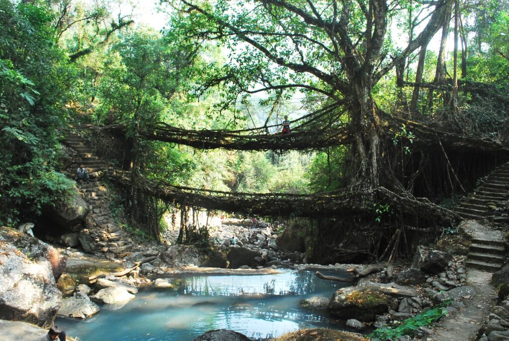Just a short walk from Mawlynnong lies Riwai village, home to a single-decker living root bridge. These bridges, made from the roots of rubber fig trees guided across streams, are a testament to the Khasi tribe’s ingenuity. The 10–15 minute hike to the bridge is easy and scenic, passing through bamboo groves and small streams.